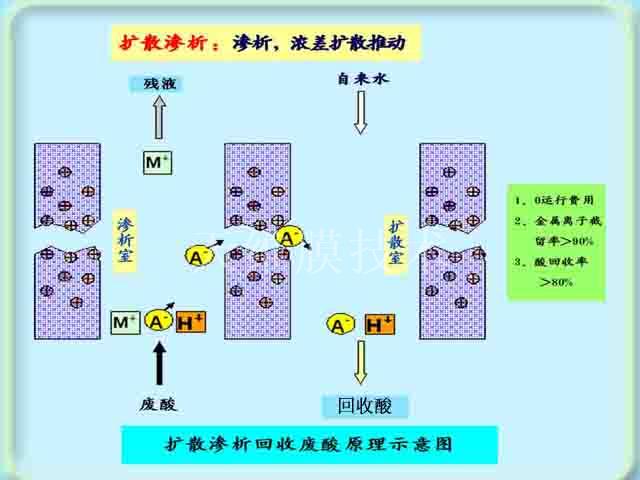 整個(gè)裝置是由一定數(shù)量的膜組成的一系列結(jié)構(gòu)單元;其中每個(gè)單元由一張陰離子均相膜隔開成滲析室和擴(kuò)散室,采用逆流操作,在陰離子均相膜的兩側(cè)分別通入廢酸液及接受液(自來水)時(shí),廢酸液側(cè)的酸及其鹽的濃度遠(yuǎn)高于水的一側(cè),根據(jù)擴(kuò)散滲析原理,由于濃度梯度的存在,廢酸及其鹽類有向擴(kuò)散室滲透的趨勢,但膜對陰離子具有選擇透過性,故在濃度差的作用下,廢酸側(cè)的陰離子被吸引而順利地透過膜孔道進(jìn)入水的一側(cè)。同時(shí)根據(jù)電中性要求,也會(huì)夾帶陽離子,由于H+的水化半徑比較小,電荷較少;而金屬鹽的水化半徑較大,電荷較多,因此H+會(huì)優(yōu)先通過膜,這樣廢液中的酸就會(huì)被分離出來。