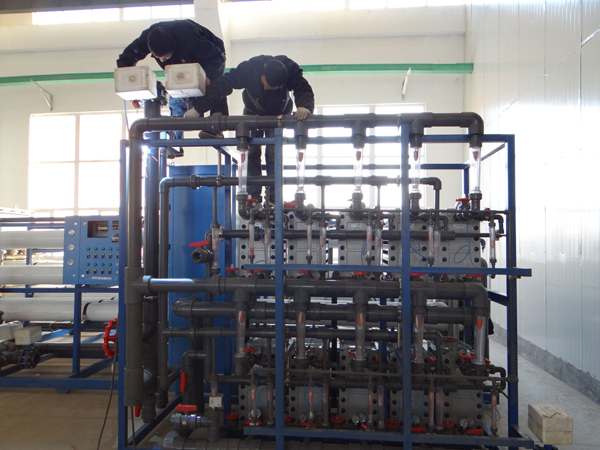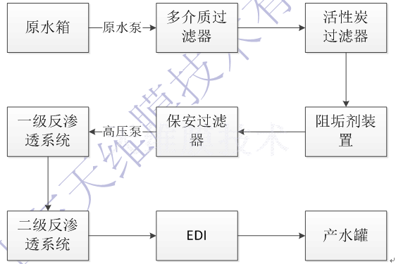 對比原水水質(zhì)情況,工藝推薦選擇工藝成熟、操作方便、運行操作費用低的雙級反滲透+EDI的水處理系統(tǒng)。在運行過程中充分考慮到水的回用,二級反滲透濃水回到一級進水,EDI濃水與極水一起回到二級反滲透作為進水。